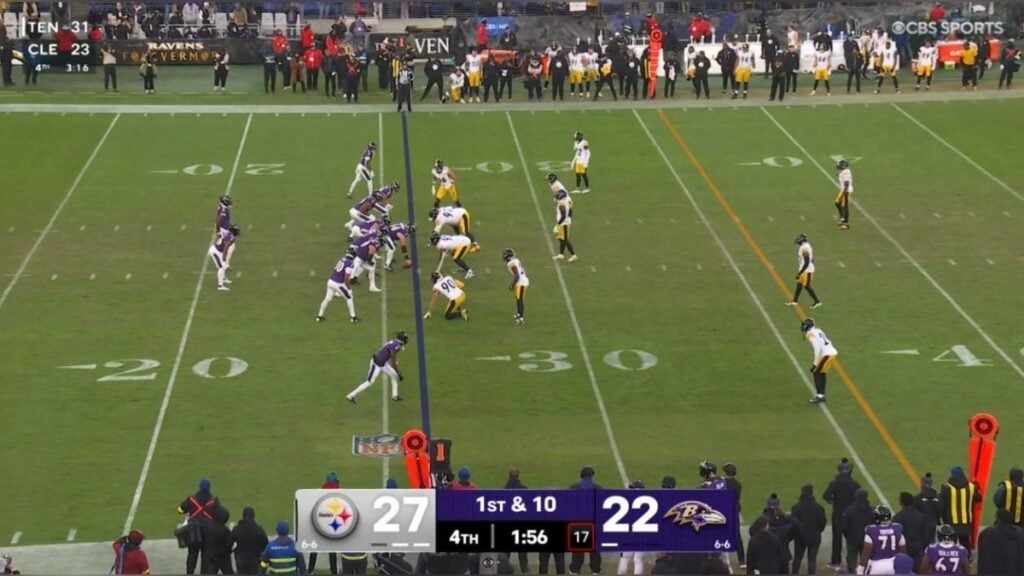 Baltimore’s no-huddle for much of the drive prevented any substitution. Whatever package Pittsburgh came out with would be one they’d be committing to. And the Steelers chose to sideline Herbig. He played three snaps, replacing Highsmith at ROLB. One of them was a spike.