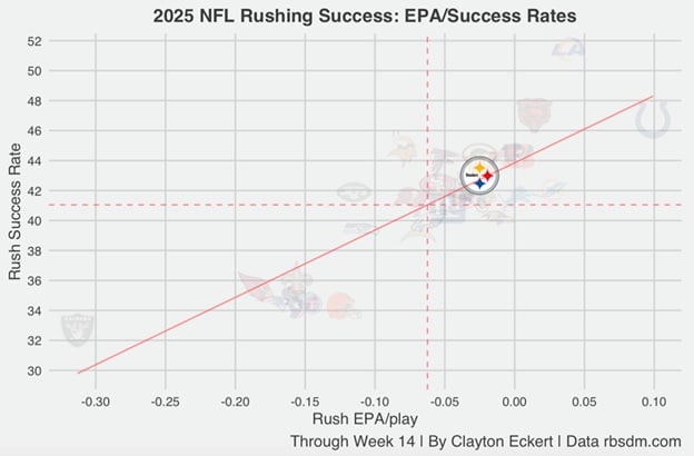 In both respected stats, the Pittsburgh Steelers run game has been an above average unit in 2025. In fact, they are a top 10 in each through Week 14. This may come as a surprise, considering the lack of attempts and general stat production, particularly the past couple games.