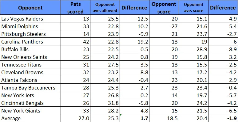 These are pretty straightforward so I’ll explain a little and then pick out some fun facts. The first three columns compare what the Patriots scored against each of their opponents, followed by the average score that opponent allows and then the difference. You want to be on the positive side of this metric — for example the 19.2 points above what the Carolina Panthers typically allow is much nicer than the -12.5 against the Las Vegas Raiders.