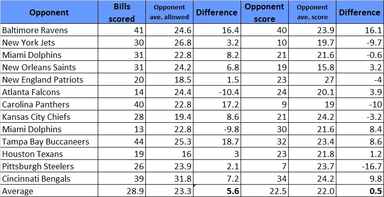 The Bills’ opponents have allowed 23.3 points per game — just 0.2 points per game worse than league average, or pretty much exactly average. In a full season, when you run these kinds of analytics, most teams’ opponent averages wind up around league average, so this is no surprise.