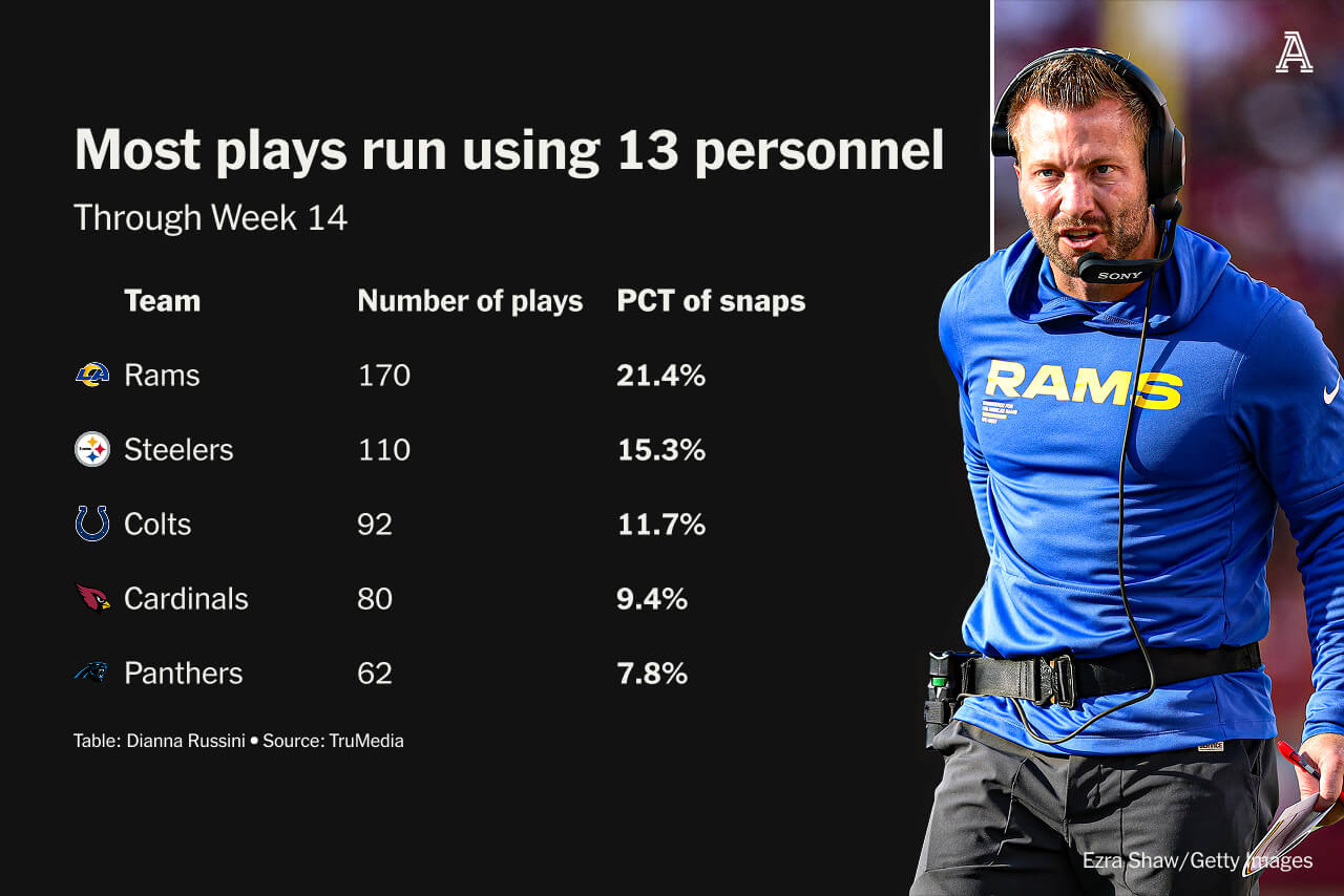 McVay has flipped his own identity this season, and it starts with 13 personnel — one running back and three tight ends. He has his team using such sets more than anyone in football. In fact, the Rams’ 170 plays run out of that grouping are more than McVay’s offenses have used in all his previous seasons combined (130), according to TruMedia.