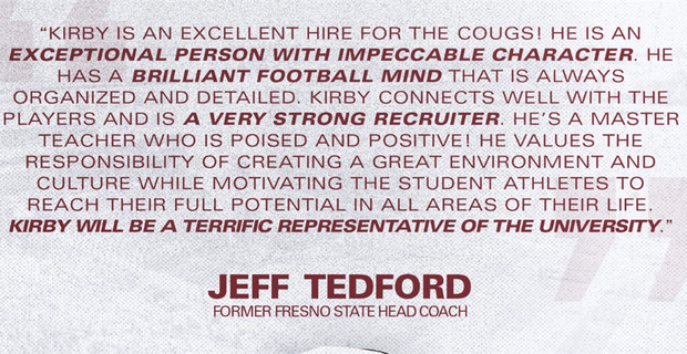 Chris Petersen, former Boise State and UW head coach: WSU just hired an outstanding person. Kirby Moore has the intelligence, temperament and character to be an excellent head coach. He comes from a wonderful football family and always seemed a step ahead when it came to strategy and tactics of the game. I have known Kirby for many years and have had the pleasure of watching him grow into an exceptional coach. His former teammates, staff members and players have always respected his football intellect, his coaching abilities but most importantly, who he is as a person. Well done Cougs, you just got one heck of a coach.