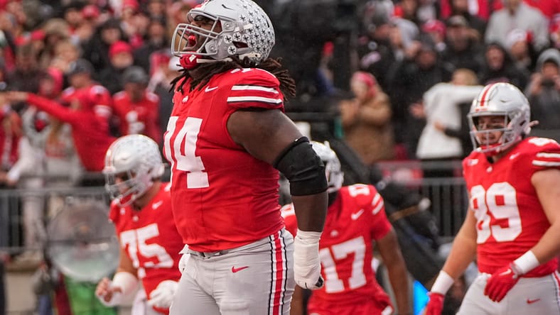 Ohio State Buckeyes offensive lineman Donovan Jackson (74) celebrates a touchdown by TreVeyon Henderson during the NCAA football game against the Indiana Hoosiers at Ohio Stadium in Columbus on Monday, Nov. 25, 2024. Ohio State won 38-15.