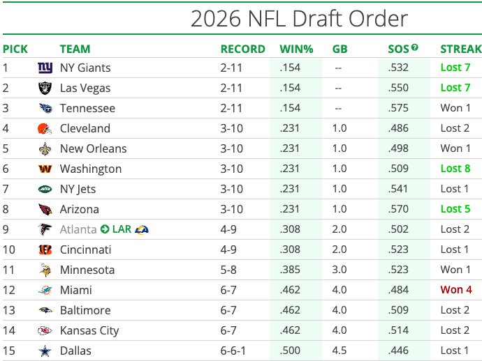 As things stand now, prior to Week 15, the New York Giants hold the first overall pick in the 2026 NFL Draft.