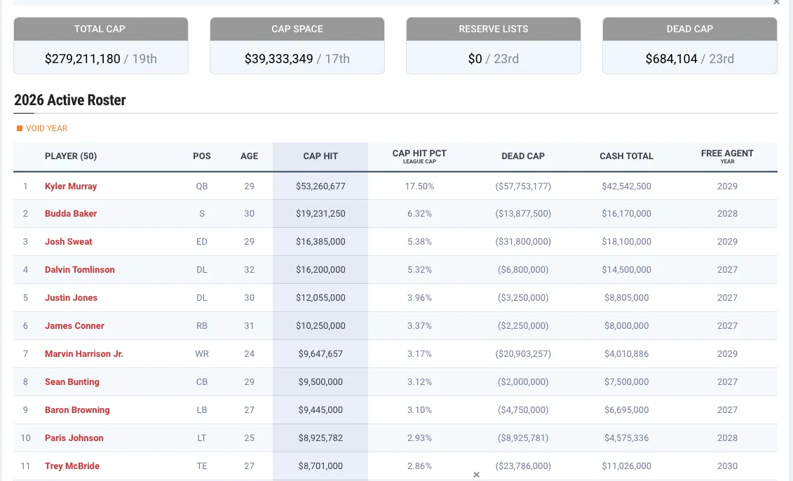 Arizona is in an interesting predicament; Kyler Murray is still under contract until 2029, but it certainly looks like a separation is coming sooner rather than later. 8 of their top 12 contracts for 2026 are at or above 30 years of age, so this is a team that is definitely in transition, but also still trying to find an identity. In this Arizona Cardinals 2026 7 Round NFL Mock Draft, I’m working under the assumption that they are moving on from Murray, so I may or may not be targeting a quarterback, even though Jacoby Brissett is a solid veteran; this team still needs its quarterback of the future.