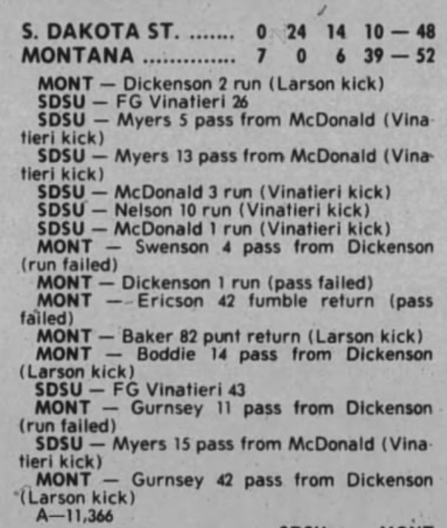 Montana’s 39 fourth-quarter points are the most ever scored in a comeback win. The historic rally was punctuated by sophomore Dave Dickenson’s go-ahead 42-yard touchdown pass to Scott Gurnsey with 21 seconds left in the game on a fourth-and-one play. Dickenson finished with four touchdowns and 401 passing yards in his first-ever collegiate start.