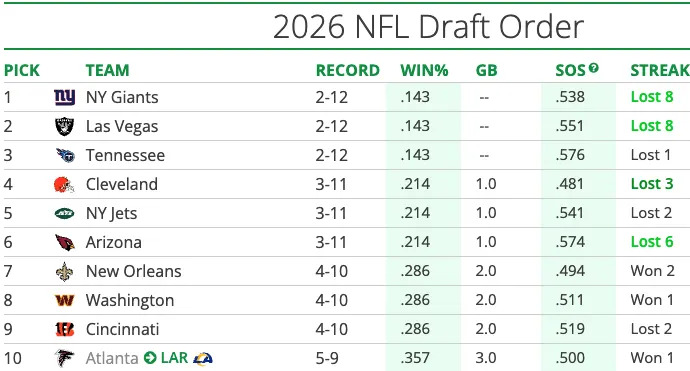 The Giants’ road to the first overall pick is a tight one. They share a 2-12 record with the Tennessee Titans and Las Vegas Raiders (who they play in two weeks). The Jets, Browns, and Arizona Cardinals are also each a game out of the first pick at 3-11, though the Saints managed to beat the Carolina Panthers and improve to 4-10 on the season.