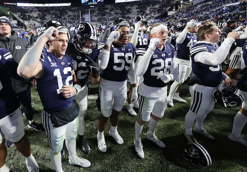 BYU quarterback Jake Retzlaff (12) and his teammates celebrate their won over the Houston Cougars in Provo on Saturday, Nov. 30, 2024. BYU won 30-18. | Jeffrey D. Allred, Deseret News