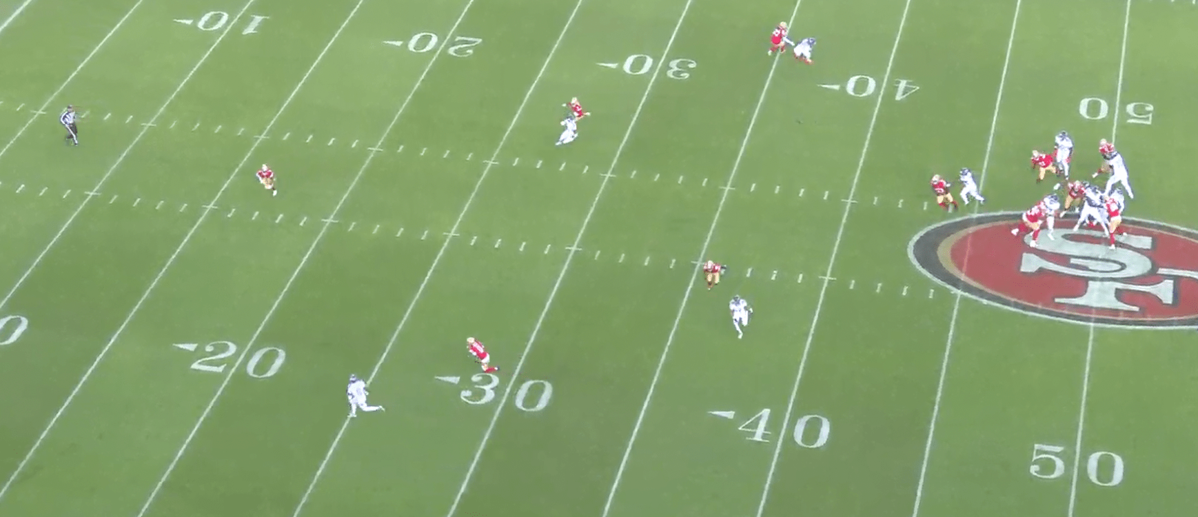 Kyle Shanahan has a firm understanding of where Jennings excels as a player. On 3rd and goal from the four-yard line, Jennings, who has primarily lined up as an outside receiver, was in the slot here. He ran a “return” route and used his big frame to shield the defender and haul in a touchdown. Give the offensive line some credit here, as Purdy had about 3.43 seconds to throw without any pressure.