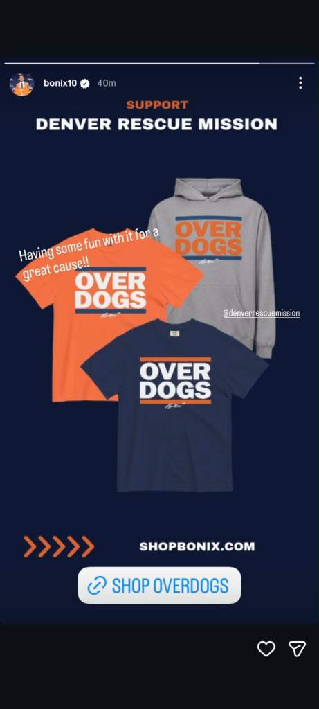 “All proceeds from the sale of Overdogs gear benefit Denver Rescue Mission,” the post explained, adding that the organization works to bring an end to homelessness across metro Denver and northern Colorado.