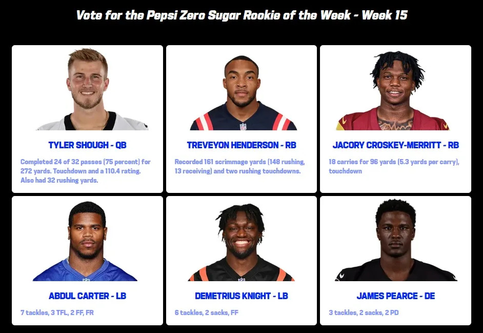 This week, Commanders running back Bill Croskey-Merritt has been nominated for the Pepsi Zero NFL Rookie of the Week award for his outstanding play in the team’s Week 15 victory over the New York Giants.