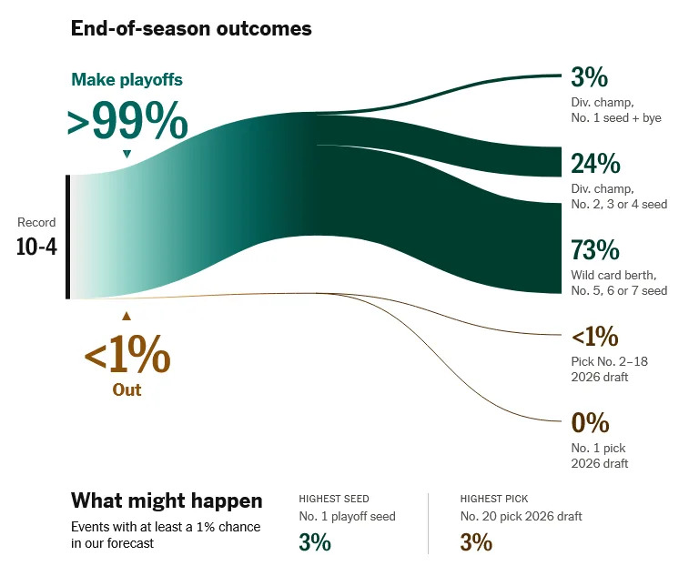 Let’s also take a look at Buffalo’s playoff odds courtesy of The Athletic. In their current 2025 NFL Playoff Simulator, the Bills now has the fourth-best playoff odds in the path to the NFL playoffs, which is interesting when you consider how much better their odds are over any AFC South team.
