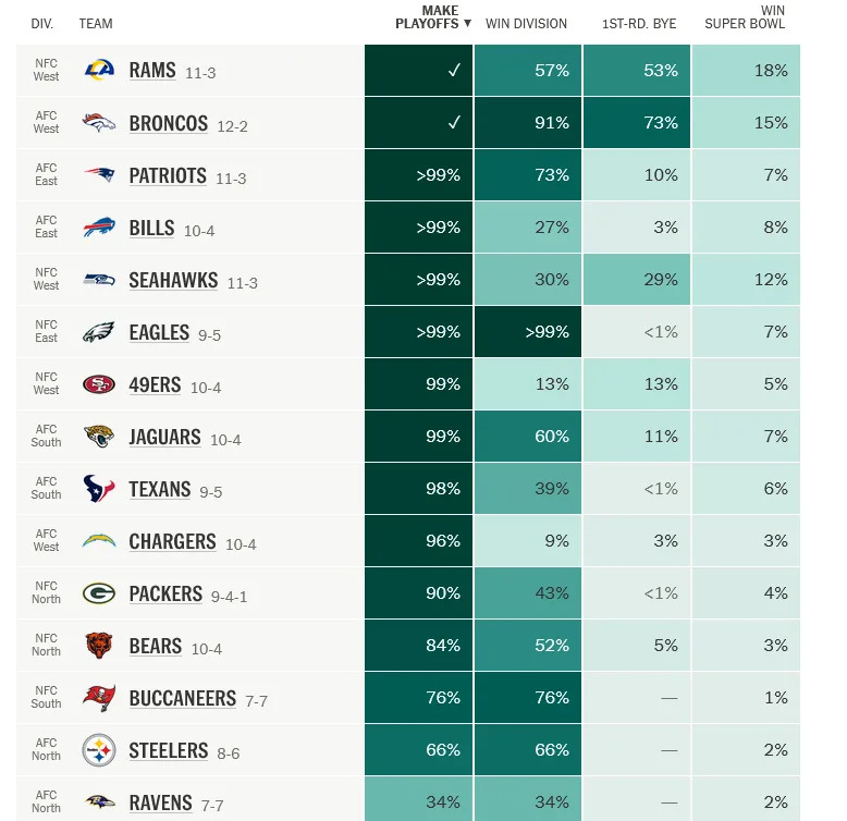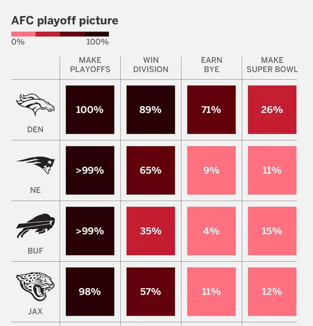“What was more important last weekend − their defeat of New England (keeping Buffalo’s AFC East title hopes alive), or Kansas City’s loss (removing a massive impediment on the Bills’ path to Super Bowl 60)?” — Nate Davis