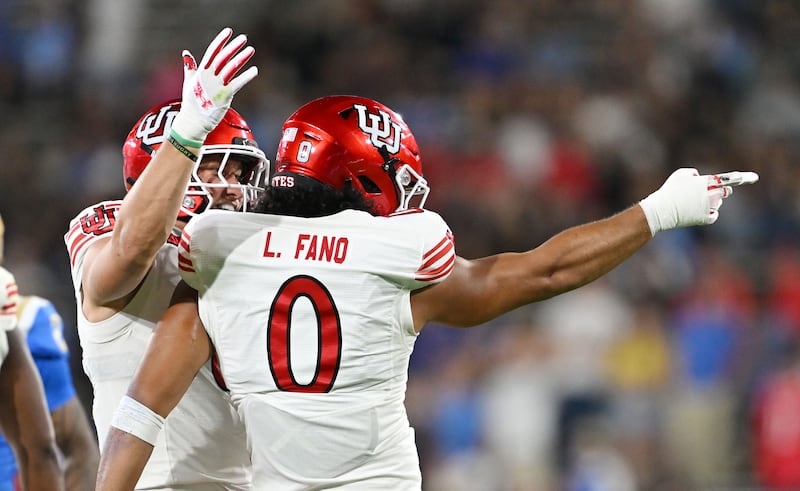 Utah Utes defensive end Logan Fano (0) celebrates after sacking UCLA Bruins quarterback Nico Iamaleava (9) as Utah and UCLA play at the Rose Bowl in Pasadena, Calif., on Saturday, Aug. 30, 2025. | Scott G Winterton, Deseret News