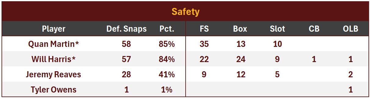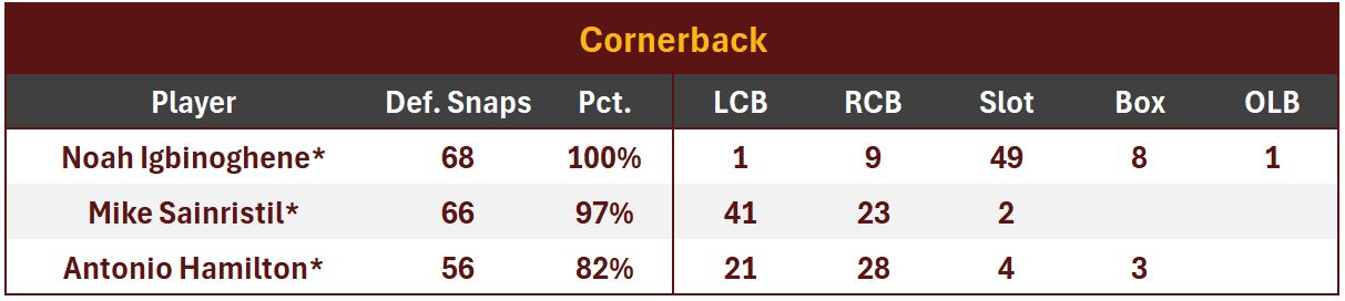 Mike Sainristil split time on both sides of the formation, with around 2/3 of his time spent at left outside CB. Sainristil recorded 3 tackles, 1 PBU, and 1 INT returned for 55 yds. In coverage, PFF recorded 5 tgt, 3 rec for 40 yds (0.93 Y/Cov Snp) and 1 TD. PFR counted 7 tgt, 4 rec for 57 yds (1.33 Y/Cov Snp) and the TD.