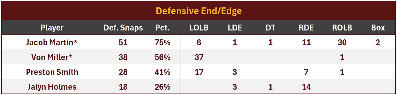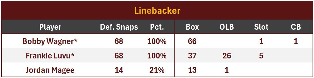 Not to be outdone, starting OLB Von Miller chipped in 2 tackles, 1 assist, 1 TFL (3 total stops), 1 sack and 2 QB hits (11.5% Pressure Rate). Miller was the Commanders’ second most productive run stopper, with 2 stops in 12 rushing downs (16.7% Run Stop Rate).