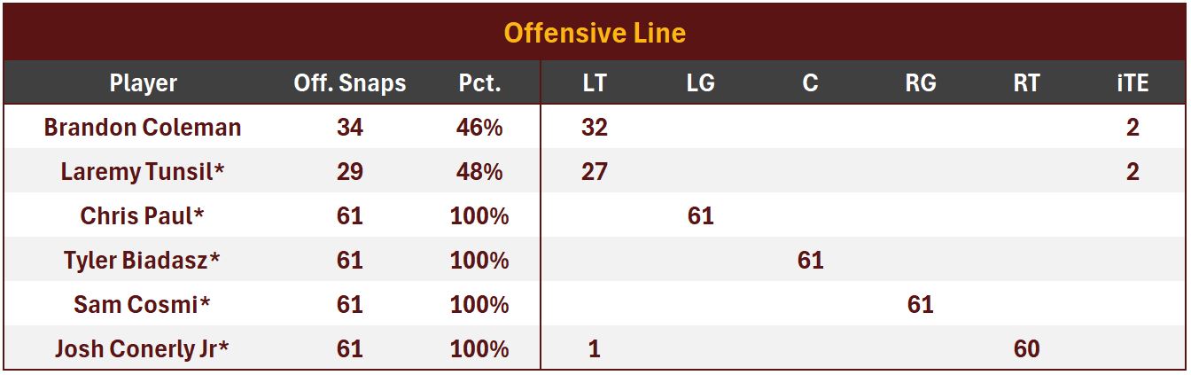 Coleman held his own in relief of the starter, also allowing 0 pressures, while recording the Commanders’ second highest run blocking grade, 71.3.