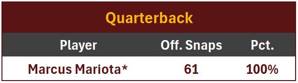 Marcus Mariota played the whole game for Jayden Daniels, who has now been shut down for the rest of the season with an elbow injury. Mariota completed 10 of 19 passes for 211 yds and 1 TD, while taking 2 sacks for 16 yds. He fumbled twice, losing one.