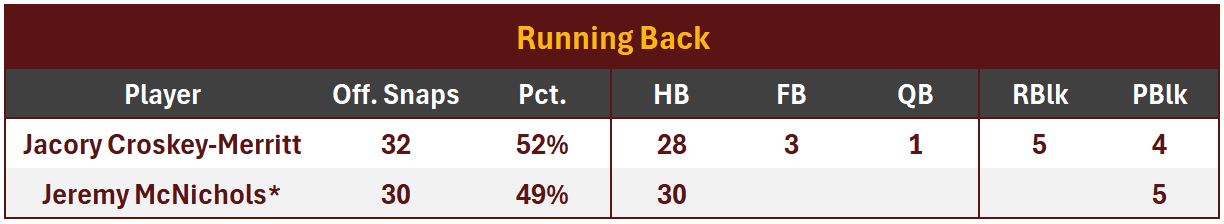 Bill Croskey-Merritt took full advantage of increased carries due to the absence of Chris Rodriguez, rushing 18 times for 96 yds (5.3 Y/A), 7 first downs and 1 TD. He fumbled once, but it was recovered by Washington. He achieved an impressive rushing success rate of 72.2. This is the second week in a row that Washington’s lead back had a success rate over 72%.