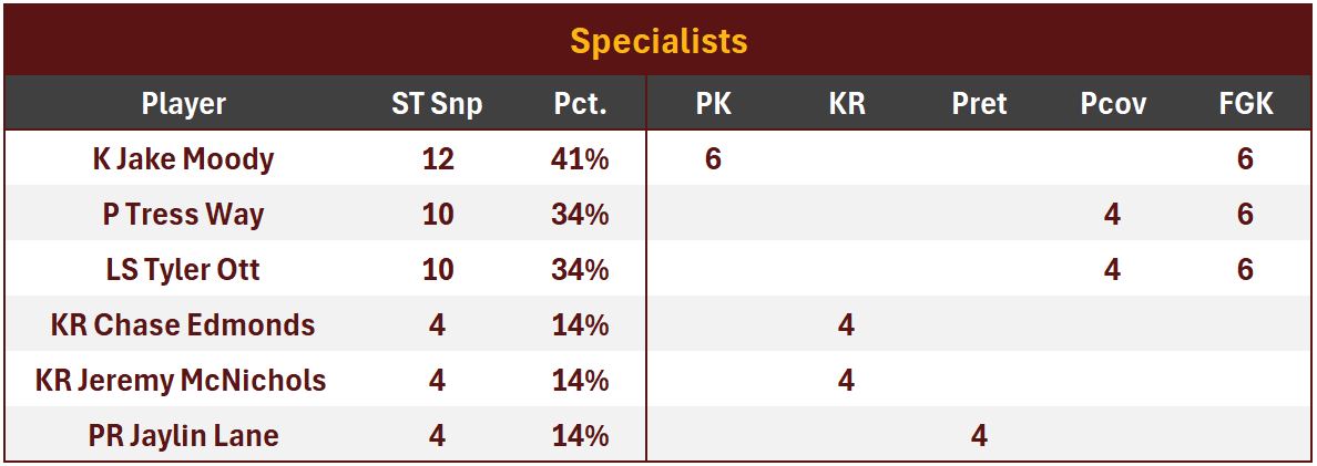 Treylon Burks and Jaylin Lane combined for 3 targets without a catch. Burks collected his first flag as a Commander for offensive holding (10 yds).