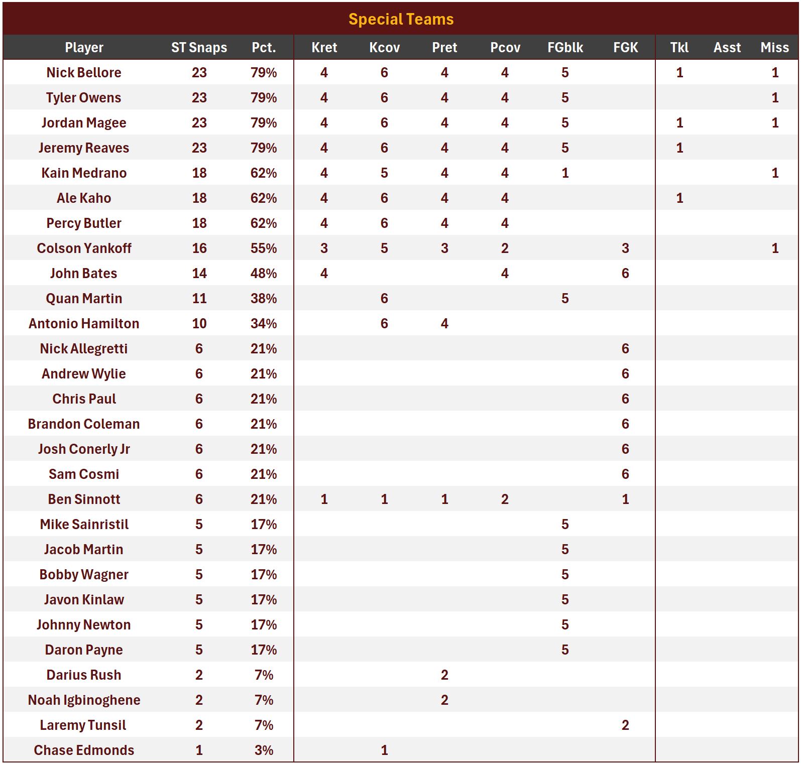 Kain Medrano, Tyler Owens and Colson Yankoff each missed one tackle. Owens was also penalized 9 yds for an illegal block above the waist on a kickoff return in the third quarter.