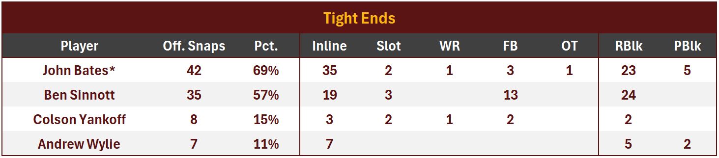John Bates also spent more than half his time on the field as a blocker. He also caught his only target and produced a 19 yd reception. His productivity as a receiver (1.46 Y/RR) was more modest than Sinnott’s. Bates also graded poorly as a run blocker (49.5) counter to his usual standard.