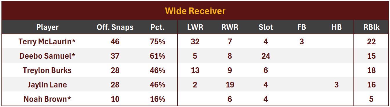 Noah Brown made a contested catch on his lone target for 28 yds. He only ran 5 routes before leaving the game with an injury and consequently led the Commanders in receiving productivity at an awesome 7.0 Y/RR.