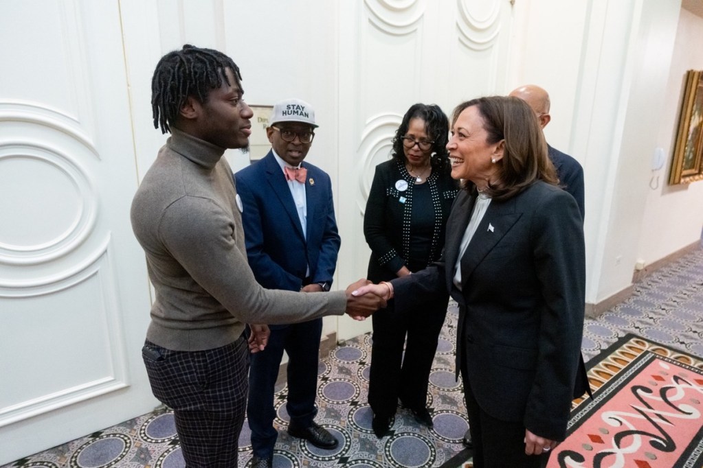 A member of a YMCA program and Michael DeVaul (wearing bow-tie) meeting Kamala Harris (who was Vice President at the time) during the YMCA youth boys program’s 2nd annual National Convening in Washington D.C. in 2023. Credit: Michael DeVaul