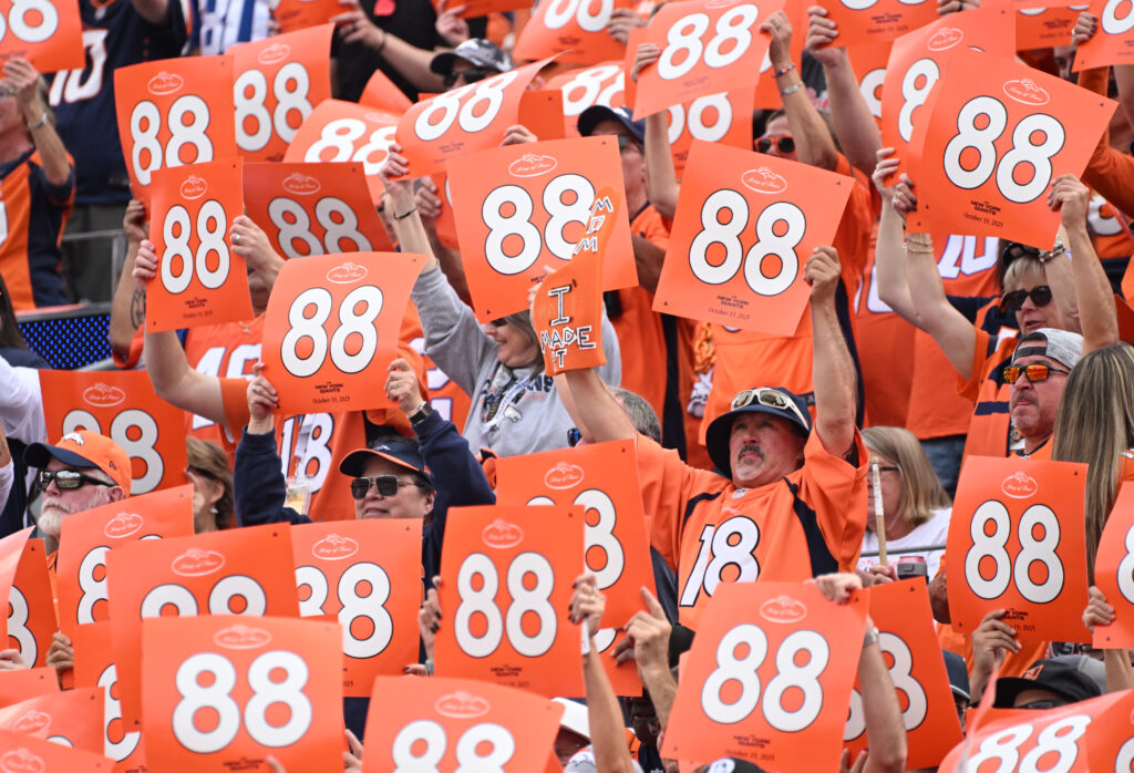 Fans in the south stands honor former Broncos wide receiver Demaryius Thomas at the start of the game against the New York Giants Sunday, Oct. 19, 2025, at Empower Field at Mile High in Denver. Thomas was inducted into the Broncos Ring of Fame at halftime. (The Gazette, Christian Murdock)