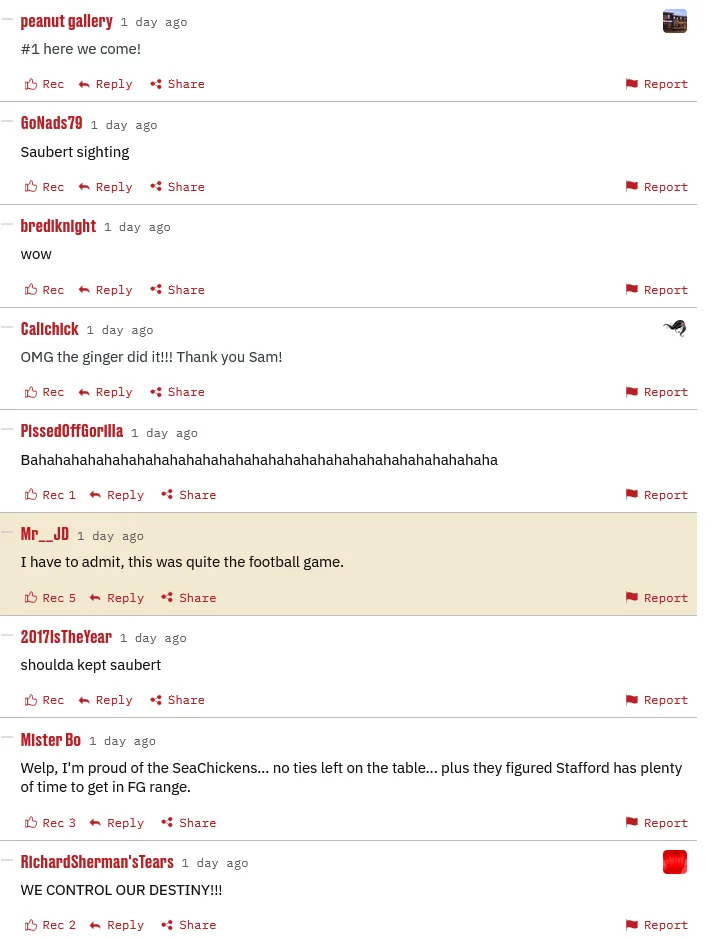 That was a truly exhilarating win and in many ways one of the most important regular season victories the Seahawks have had in ages. The job ain’t done yet, though. The Seahawks still will most likely need to win against the Carolina Panthers and the rematch with the San Francisco 49ers in order to win the division and the No. 1 seed. There is no room to ease up next week, and while there is a scenario in which the Seahawks could have the top seed locked up without relying on beating the 49ers in Week 18, I wouldn’t count on it.