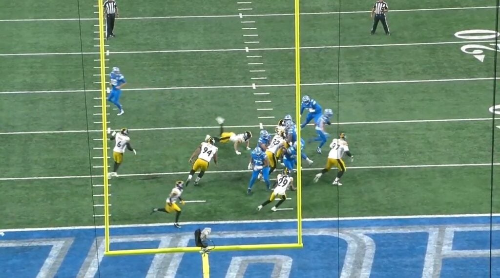 It fools everyone. Almost everyone. While LB Payton Wilson was the first to get a hand on St. Brown, he does little to slow him down. St. Brown still has a path to the end zone. The Steelers’ defense has crashed the wrong way and it should be a score for Detroit.
