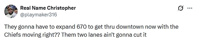‘They gonna have to expand 670 [Interstate 670] to get thru downtown now with the Chiefs moving right?? Them two lanes ain’t gonna cut it,’ one warned.