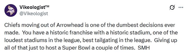Taking to X shortly after the news was confirmed, one fan said: ‘Chiefs moving out of Arrowhead is one of the dumbest decisions ever made.