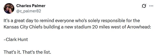 ‘It’s a great day to remind everyone who’s solely responsible for the Kansas City Chiefs building a new stadium 20 miles west of Arrowhead: Clark Hunt. That’s it. That’s the list,’ a supporter posted.