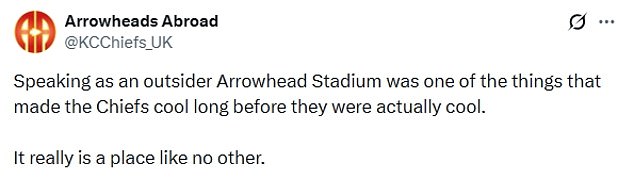 ‘Speaking as an outsider Arrowhead Stadium was one of the things that made the Chiefs cool long before they were actually cool. It really is a place like no other,’ another wrote on X.