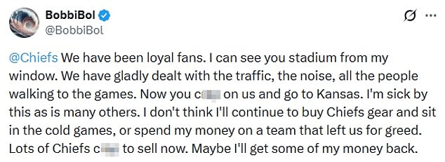 ‘Now you c*** on us and go to Kansas. I’m sick by this as is many others. I don’t think I’ll continue to buy Chiefs gear… or spend my money on a team that left us for greed.’