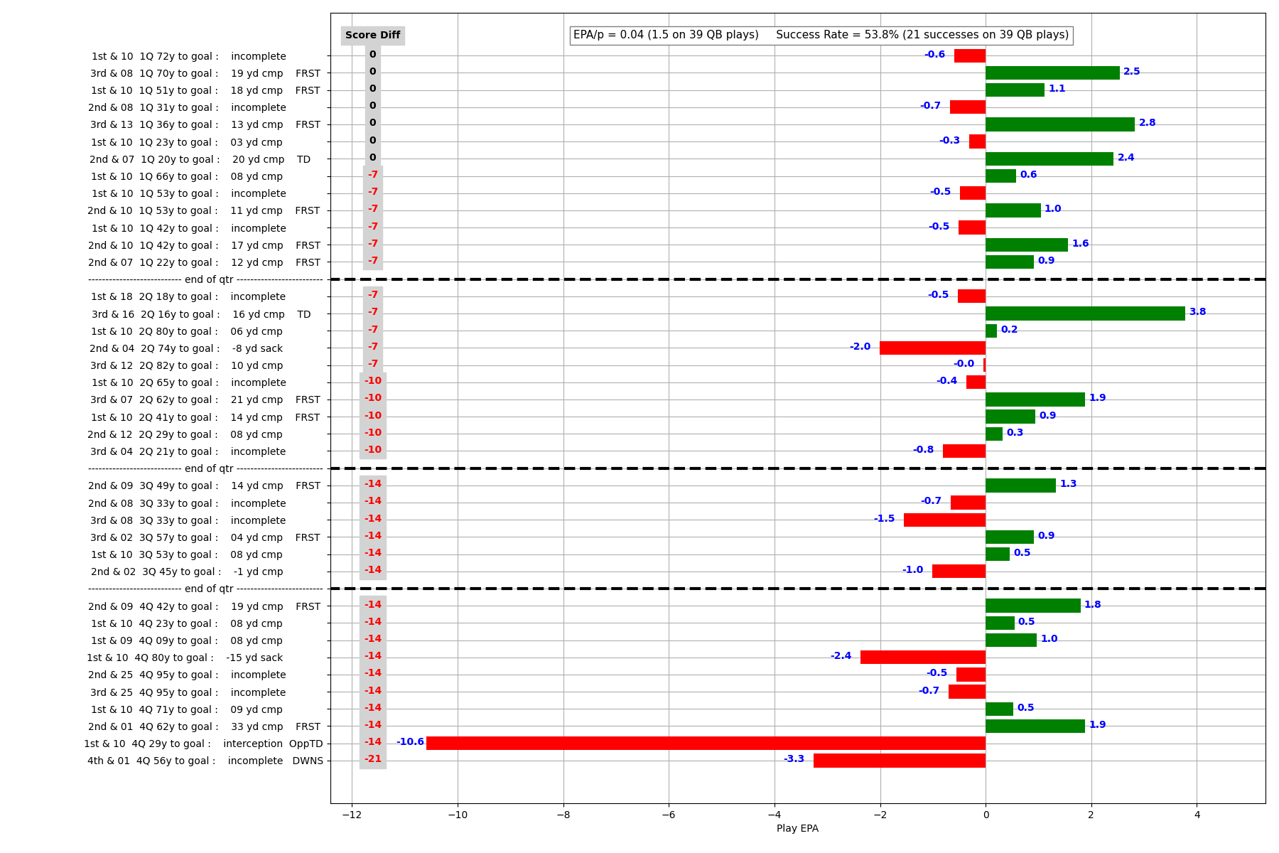On a per-play basis, Rivers was effective, consistently executing high-value passes while limiting the impact of negative plays. However, the pick-six was a massive negative event that erased any realistic chance of a comeback, tanking his overall EPA efficeincy.
