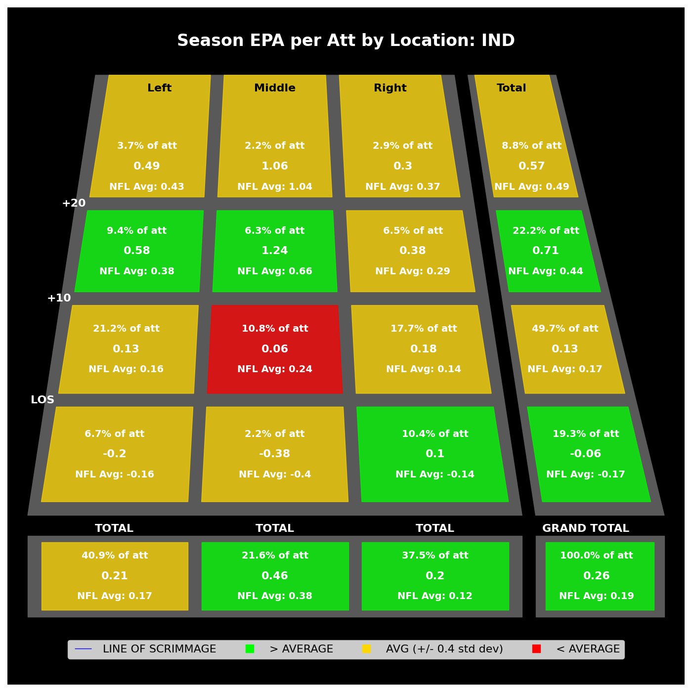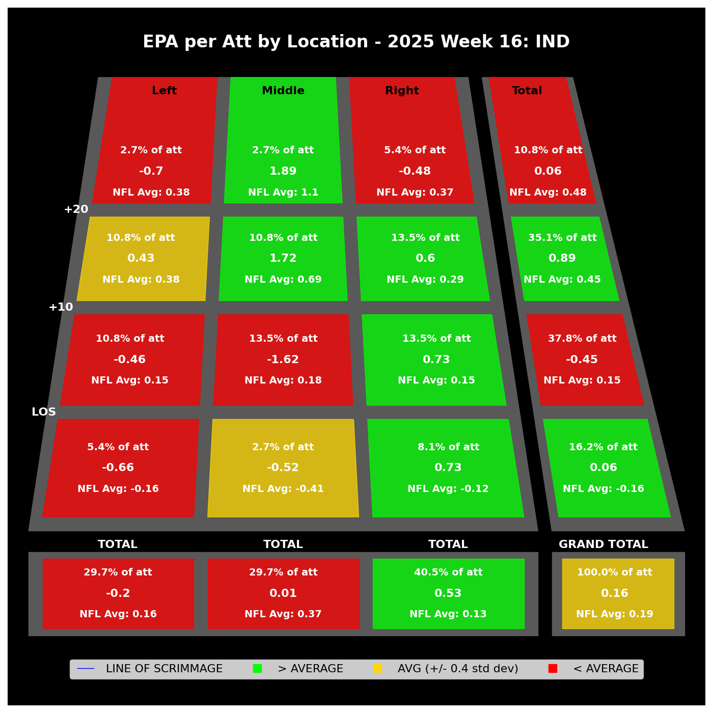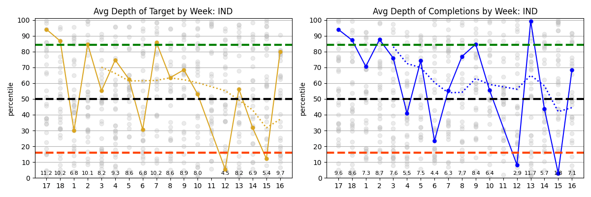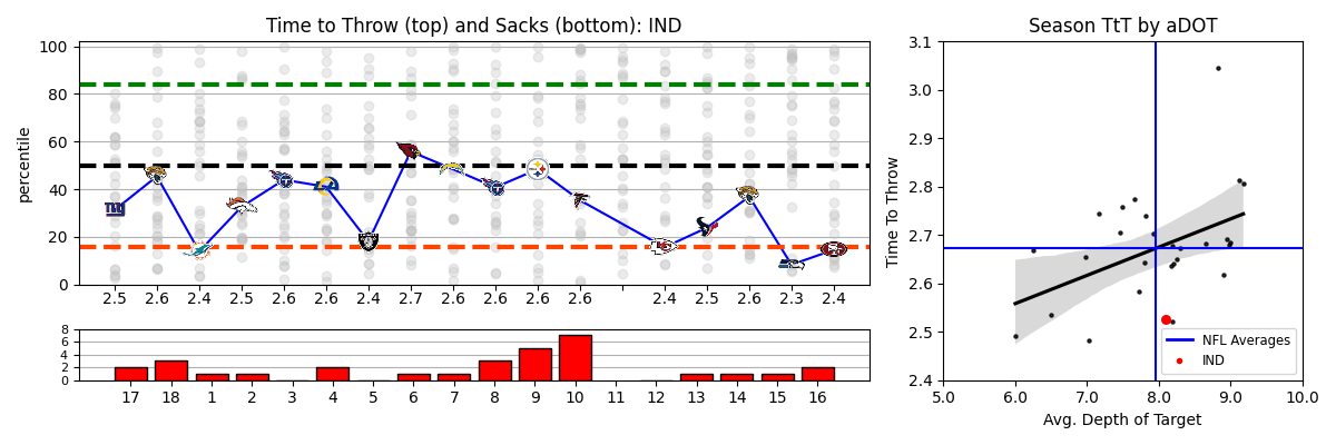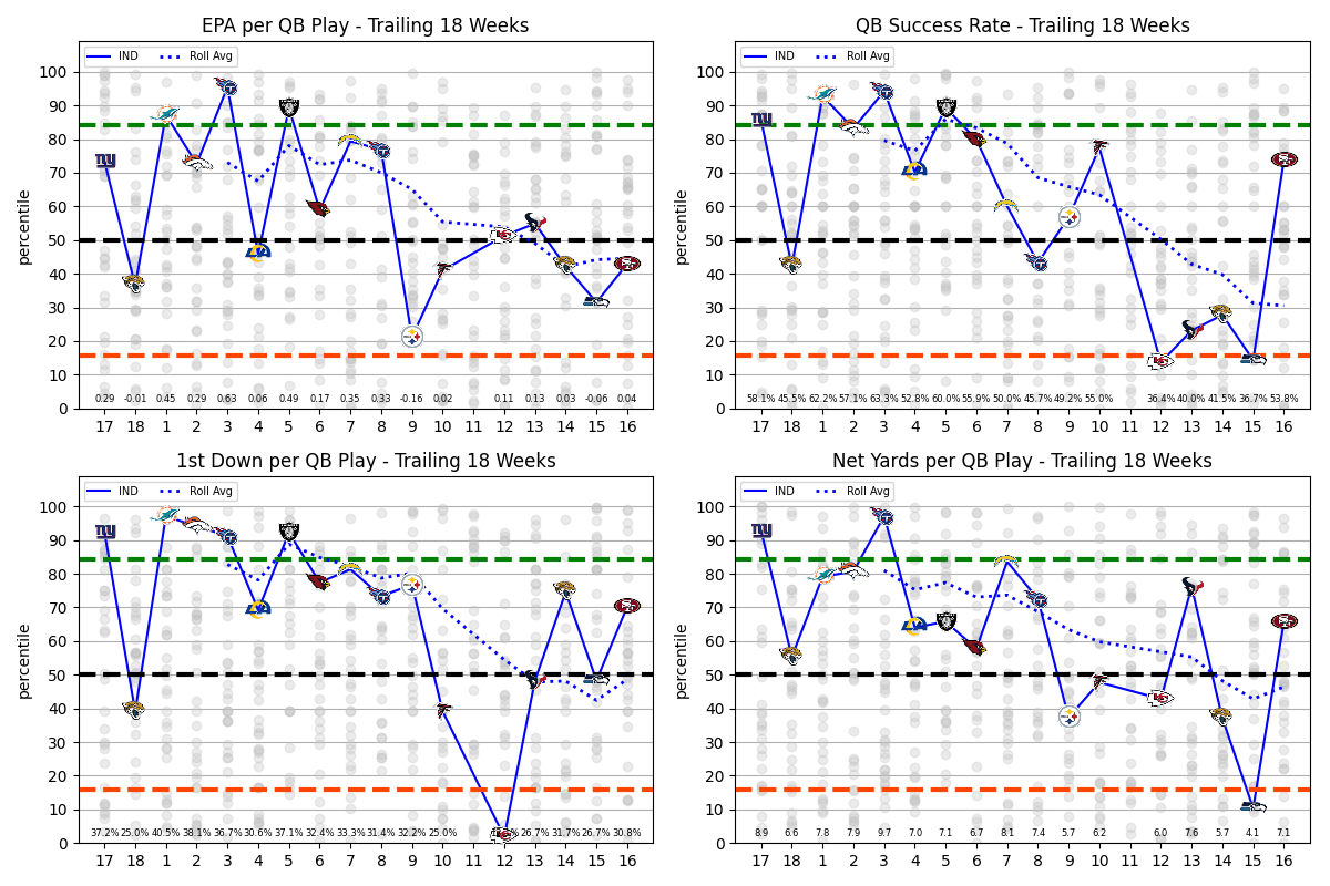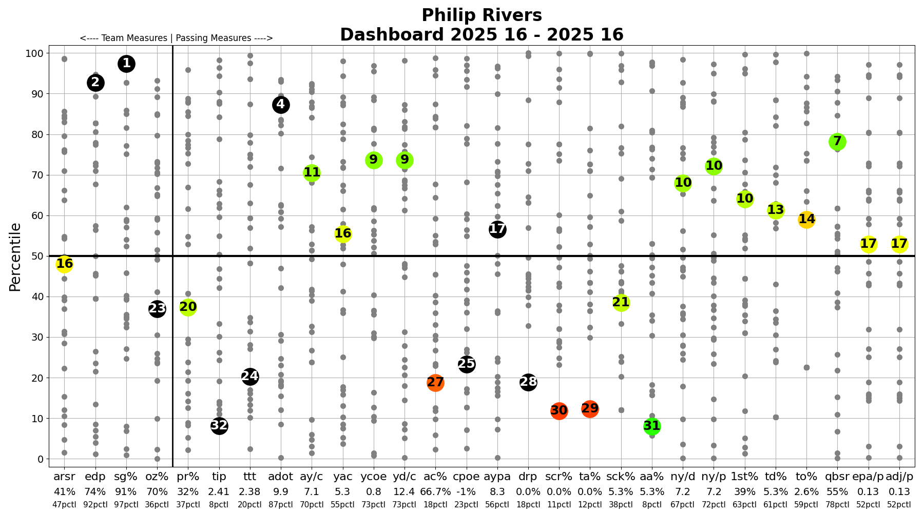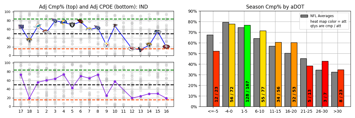 The Colts leaned heavily on the pass, with a supporting run game that was largely ineffective (2nd EDP, 16th ARSR).Rivers faced below-average pressure, driven primarily by his fast time to throw (20th PR%, 24th TTT). Given how quickly he was getting the ball out, I would have expected even less pressure, which suggests the offensive line struggled.Despite the quick throws, target and completion depth were long (4th ADOT, 11th AY/C).Given the depth of his throws, receiver YAC was solid, but in the 4th quarter his incompletions began to pile up, depressing his adjusted completion rate (27th AC%, 16th YAC). That combination ultimately led to a fairly average yards per attempt (17th AYPA).However, in typical Rivers fashion, he did not abandon plays, recording 0 scrambles, 0 throwaways, and 2 sacks (30th SCR%, 21st SCK%, 29th TA%). That low abandon rate boosted his relative dropback efficiency, resulting in a top-10 yards per dropback mark (10th NY/P).That yardage efficiency translated into a high number of first downs and a solid touchdown rate (10th 1st%, 13th TD%).