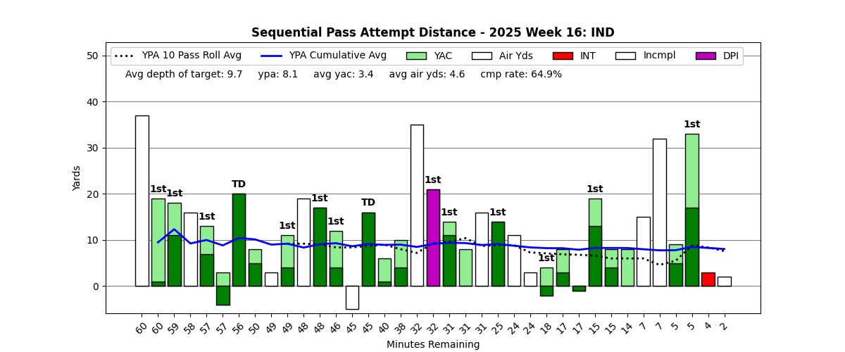 With the longer passes, the completion rate was depressed relative to the league. Surprisingly, CPOE was low as well. I didn’t get that impression while watching the game, but that’s why I measure these things—because feelings and the eye test aren’t very reliable.