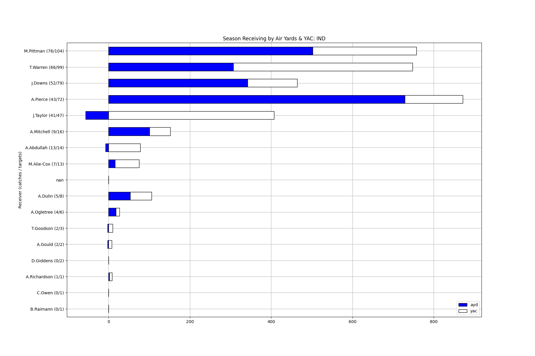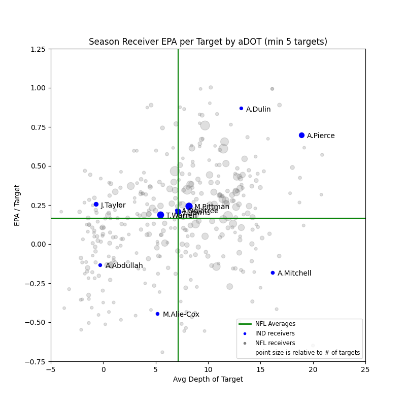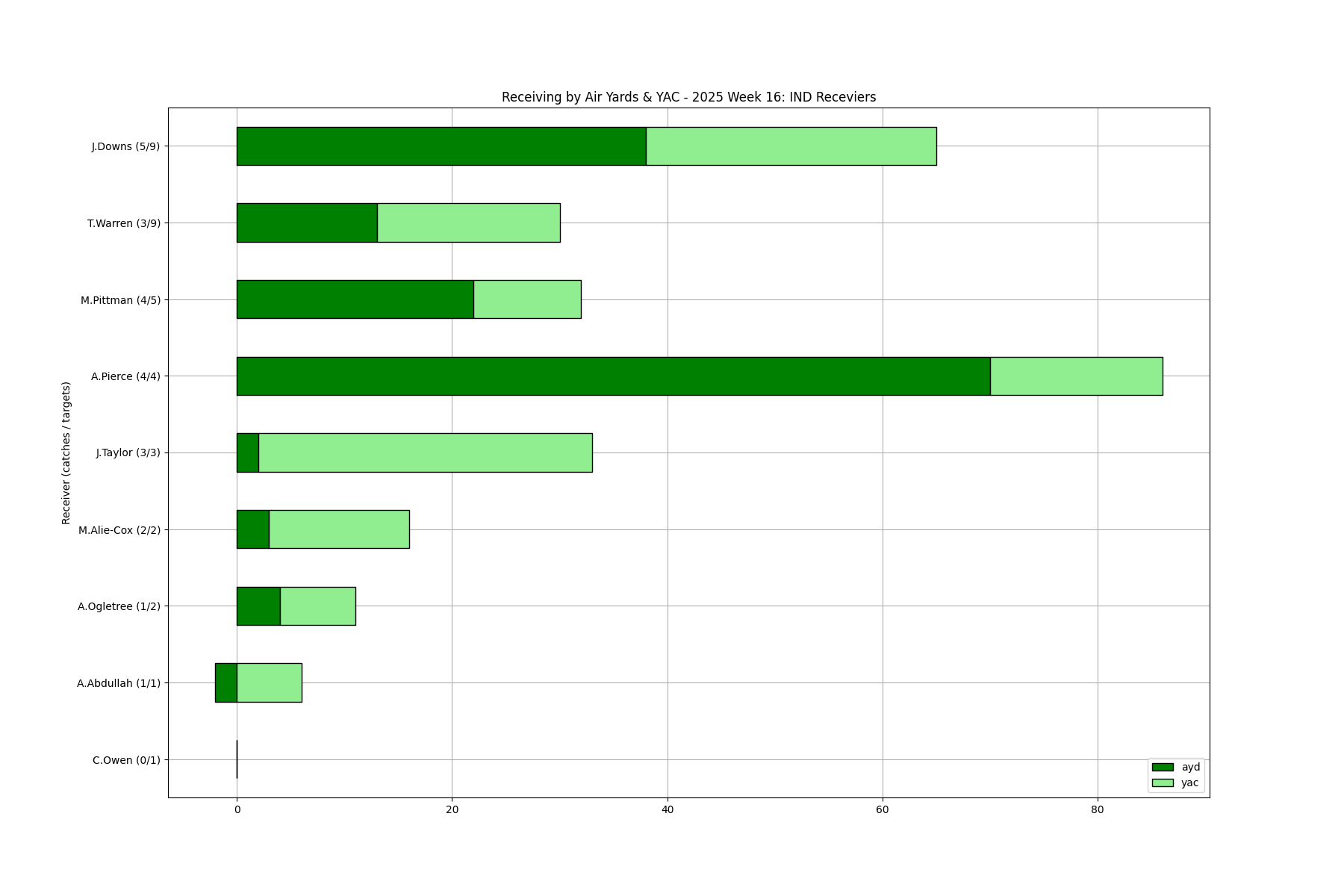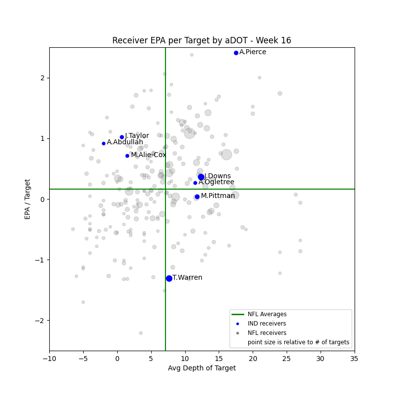 Downs and Warren led the team in targets, but Pierce led the way in yardage, catching all four of his targets.