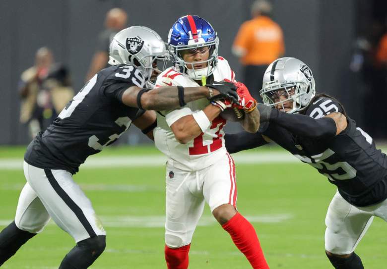 LAS VEGAS, NEVADA – NOVEMBER 05: Wide receiver Wan’Dale Robinson #17 of the New York Giants is tackled by cornerback Nate Hobbs #39 of the Las Vegas Raiders as safety Tre’von Moehrig #25 of the Raiders defends in the fourth quarter of their game at Allegiant Stadium on November 05, 2023 in Las Vegas, Nevada. The Raiders defeated the Giants 30-6. (Photo by Ethan Miller/Getty Images)