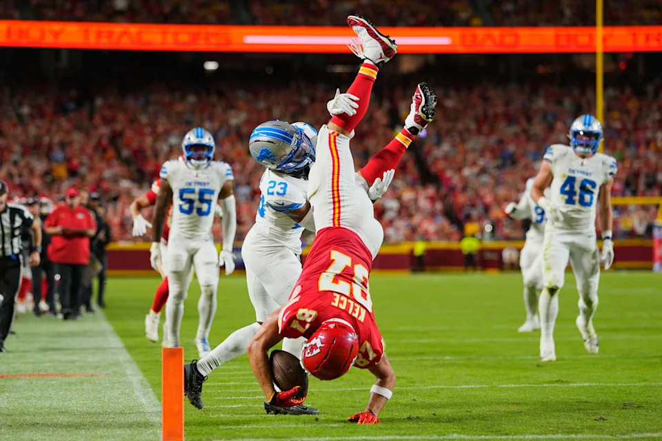 Kansas City Chiefs tight end Travis Kelce leaps over Detroit Lions cornerback Rock Ya-Sin against the Detroit Lions during the first half at GEHA Field at Arrowhead Stadium on Oct. 12, 2025