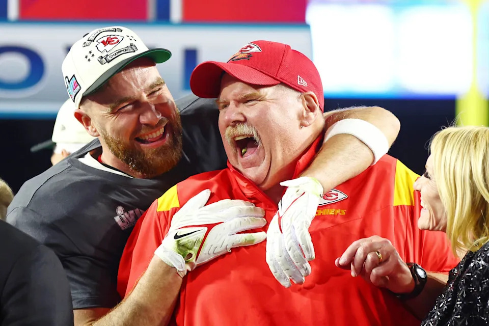 Kansas City Chiefs tight end Travis Kelce celebrates with head coach Andy Reid after winning Super Bowl LVII against the Philadelphia Eagles at State Farm Stadium in Glendale, Ariz on Feb. 12, 2023.