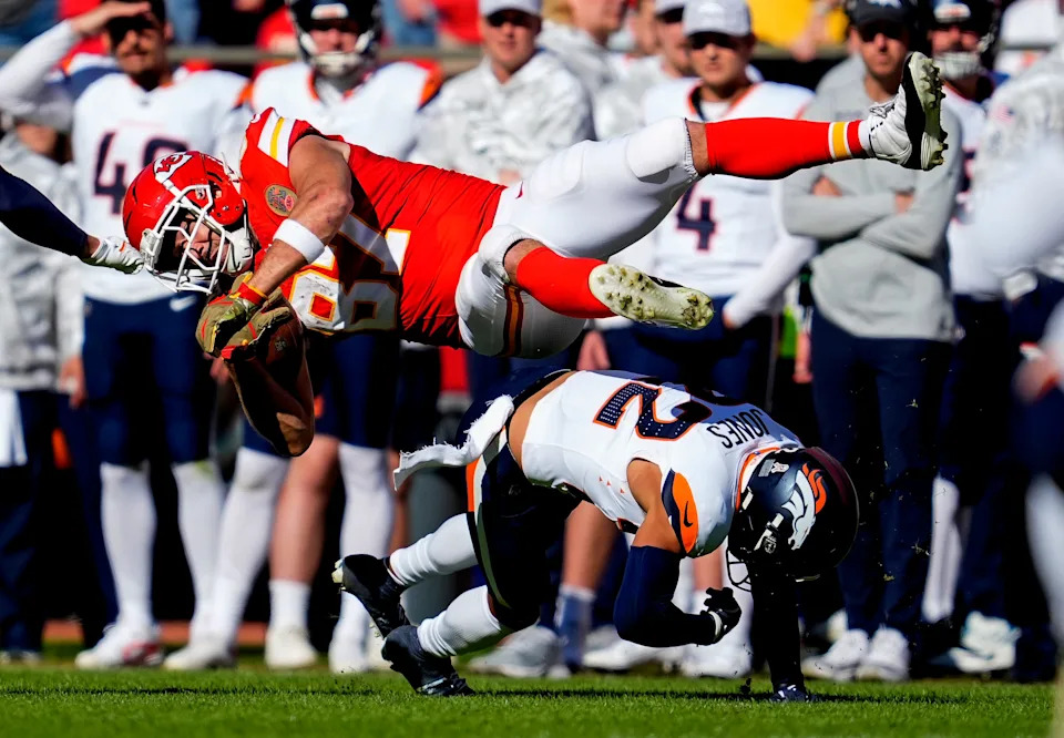Kansas City Chiefs tight end Travis Kelce is upended by Denver Broncos safety Brandon Jones during the first half at GEHA Field at Arrowhead Stadium on Nov. 10, 2024