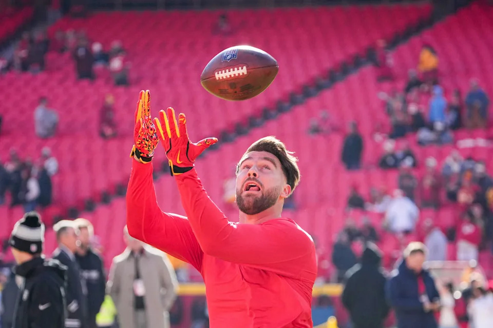Kansas City Chiefs tight end Travis Kelce warms up against the Las Vegas Raiders prior to a game at GEHA Field at Arrowhead Stadium on Nov. 29, 2024