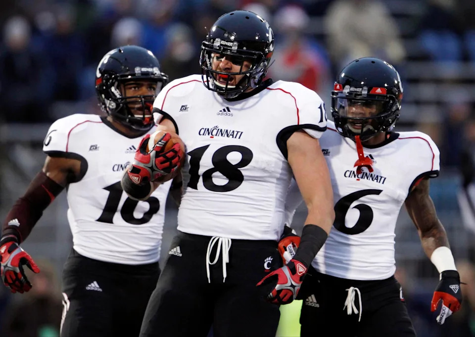 Teammates George Winn #32, Travis Kelce #18 and Greg Blair #51 of the Cincinnati Bearcats celebrate after defeating the Duke Blue Devils 48-34 during their game at Bank of America Stadium on Dec. 27, 2012 in Charlotte, NC.