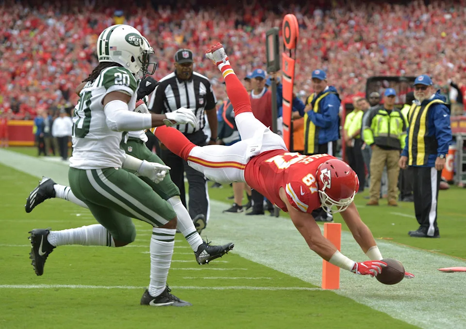 Kansas City Chiefs tight end Travis Kelce dives in for a touchdown as New York Jets cornerback Marcus Williams attempts the tackle during the first half at Arrowhead Stadium on Sept. 25, 2016.