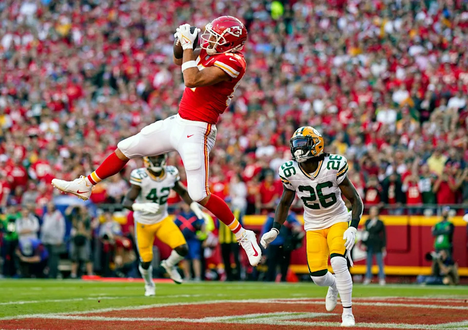 Kansas City Chiefs tight end Travis Kelce catches a touchdown pass as Green Bay Packers free safety Darnell Savage defends during the first quarter at GEHA Field at Arrowhead Stadium on Nov. 7, 2021