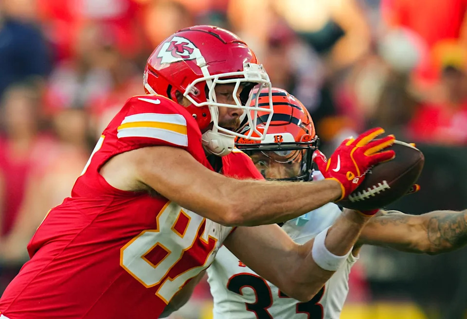 Kansas City Chiefs tight end Travis Kelce catches a pass against Cincinnati Bengals safety Daijahn Anthony during the second half at GEHA Field at Arrowhead Stadium on Sept. 15, 2024.