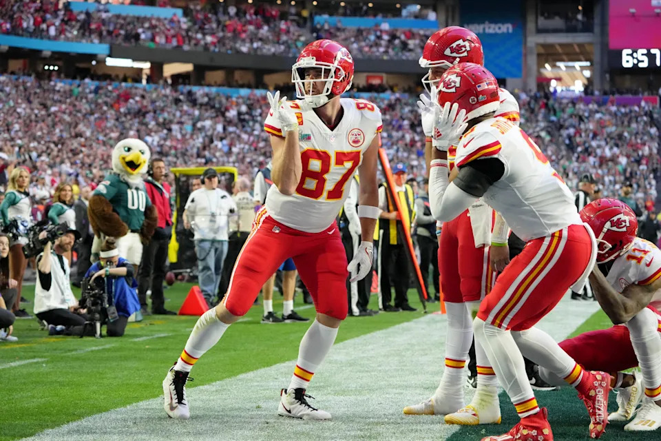 Kansas City Chiefs tight end Travis Kelce (87) celebrates with teammates after making a catch for a touchdown against the Philadelphia Eagles during the first quarter of Super Bowl LVII at State Farm Stadium in Glendale, Ariz on Feb. 12, 2023.
